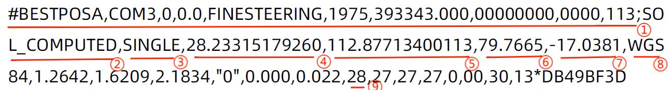 ①~⑨分别为标准消息标头、结算状态、定位状态、纬度、经度、海拔高、高程异常值、坐标系ID、可视卫星数等;其他报文字段详细对应关系可参阅《UG016_数据通信接口协议》。