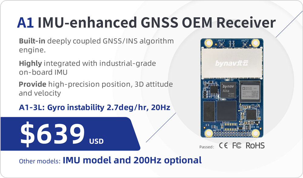 The A1 GNSS/INS receiver, measuring 46×71mm and weighing 25g, is highly integrated with an industrial-grade IMU (gyro 2.7deg/hr) with an embedded deeply coupled GNSS+INS algorithm engine as well as tilt measurement algorithm to provide stable, high precision position and attitude even in the event of GNSS outages.